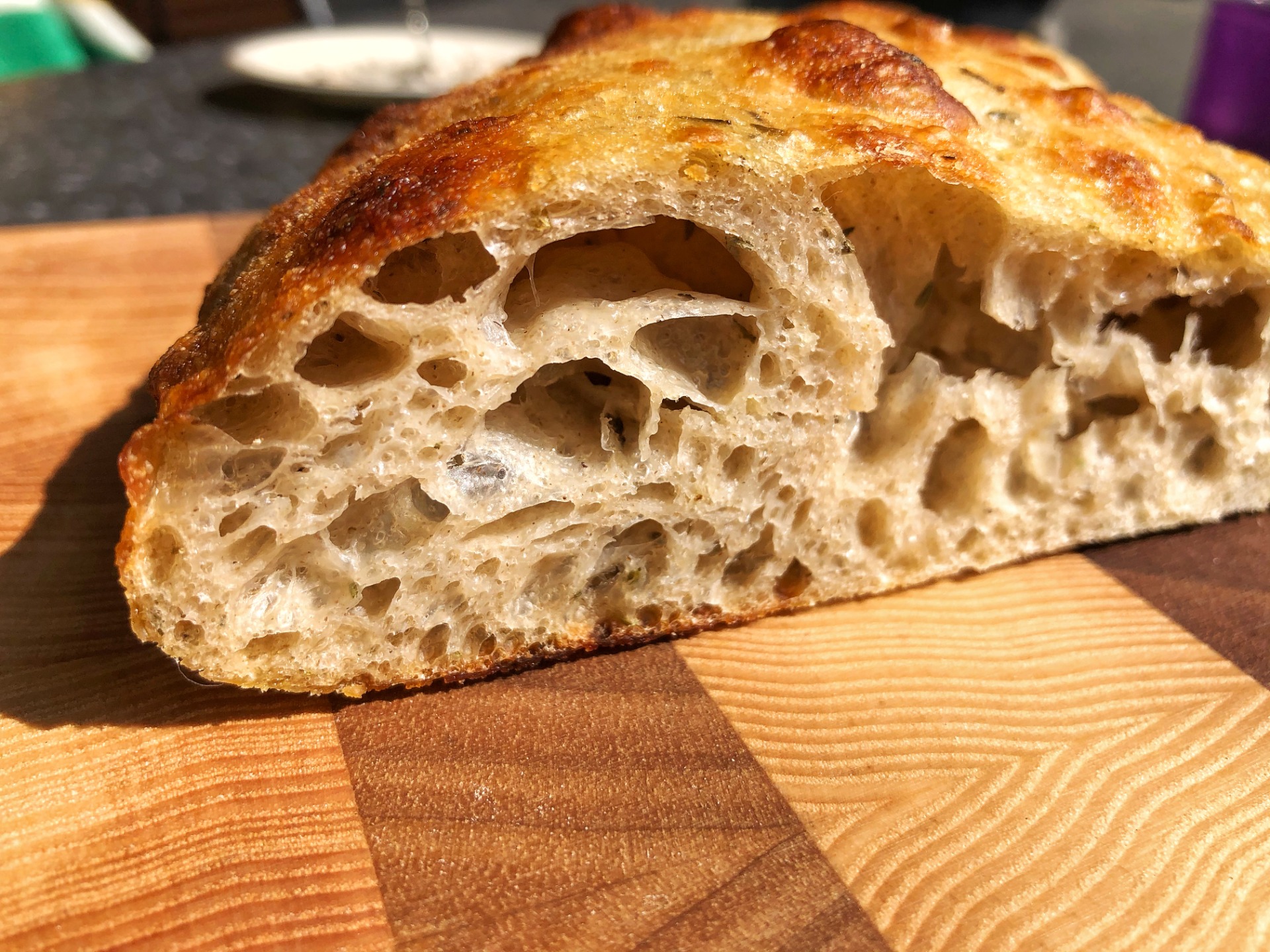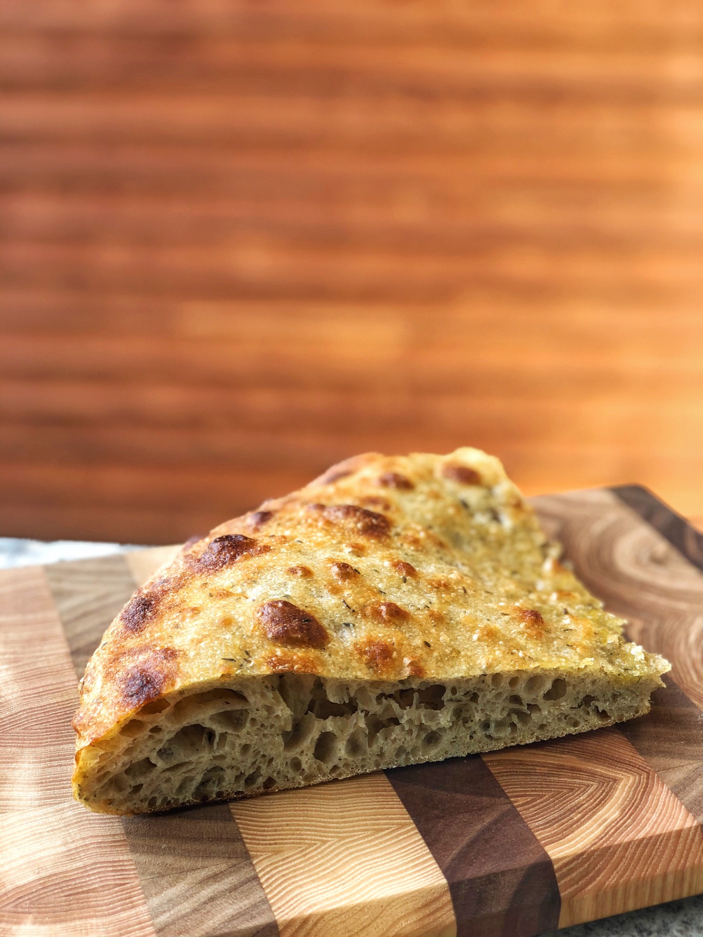 Una focaccia a lunga lievitazione con infusione di aglio e timo